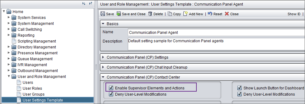 To give supervisors rights to use Communication Panel agents' recording function, select the option Enable supervisor elements and actions in .