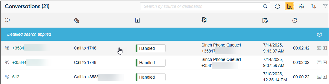 To view conversations by other users or conversations based on certain criteria, use either Search by source or destination, Detailed search, or Filter.
