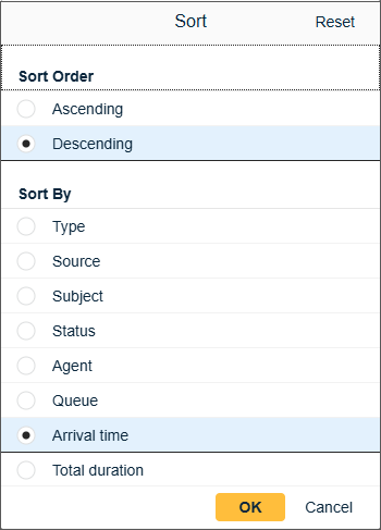 Status Choose all status values, or one from In queue, Abandoned, In process, Wrap-up, or Handled. Queue Choose all queues, or one from the queue list. Agent name Choose one from the agent list. Date range Define the date and time range with the calendar tool. The default date range is the current day. You can also enter the date and time manually. The format depends on your UI language. For example, if your UI language is English, use the format MM/DD/YY for the dates and the 12-hour format (AM/PM) for the time range.