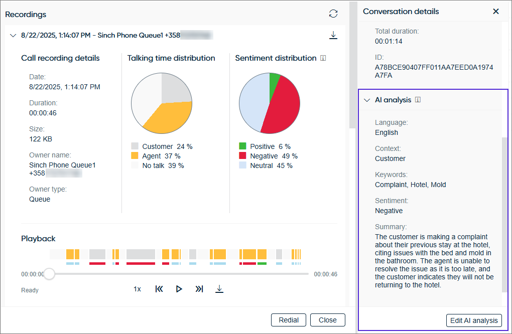 If you see an Edit AI analysis button, you'll also be able to edit the analysis. This may be useful, for example, in case of inaccuracies in the analysis. If the analysis has been edited, the name of the agent and the timestamp of the edit is shown under the analysis.