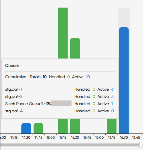 In a cumulative card, hover your cursor over the bar to see the number of handled conversations and the number of conversations that are queuing or with an agent.