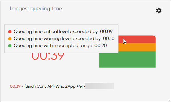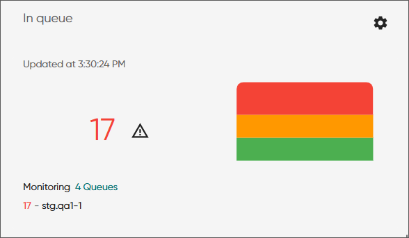 Card with a single queue: The gauge, bar, or numeric increases based on the conversation with the longest queuing time in the queue, progressing through the green stage (acceptable queuing time) yellow stage (warning level queuing time) then red (critical level queuing) until the answered-on-time limit is met or exceeded.