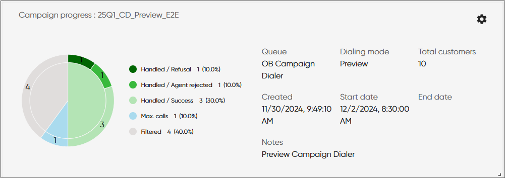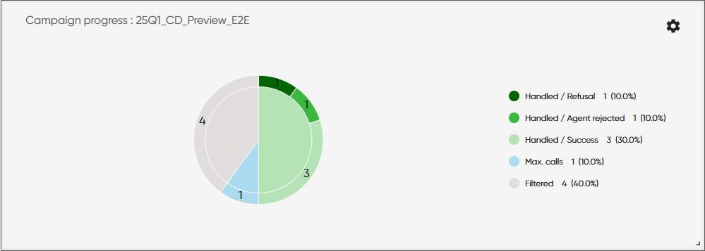 In the nested pie chart, you can see the progress of the campaign. The inner layer of the chart shows the division of campaign customers into:- Handled:
