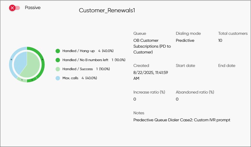 - Increase ratio: Calls made in the campaign = Free agents + (Ratio % * Busy agents)