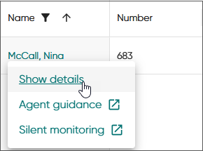 .The details view opens and shows the agent information, conversation statistics of the day, and the agent's queues and skills.