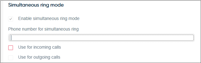 If you selected the Use SRM device number for inbound calls option, enter the additional phone number. The number in this field will be shown in Communication Panel's Phone Number for Simultaneous Ring field. You can change the phone number in both Communication Panel and System Configurator. The system updates the change into both interfaces. The number is defined at user level.