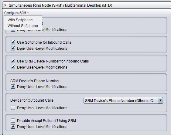 Disable Accept Button if using SRM Select this option if you want to prevent Communication Panel agents using Simultaneous Ring Mode (SRM) from accepting calls through the user interface (softphone). This means that the agent can only accept inbound calls from the external audio device. The agent can still decline a call from the user interface or external device. - Save your entries.