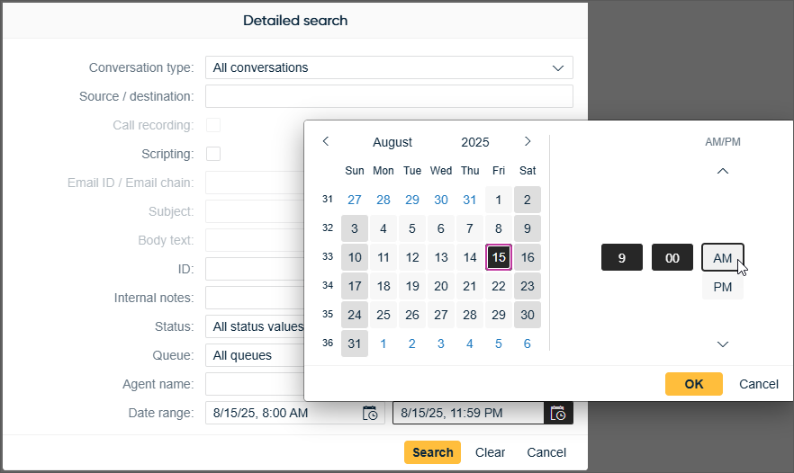 The detailed search in the Picklist and History views has a new option available to define the time range for the search. Time can be specified either by scrolling in a separate selection window or by entering it manually into the Date range field. The UI language defines which date and time format is used.