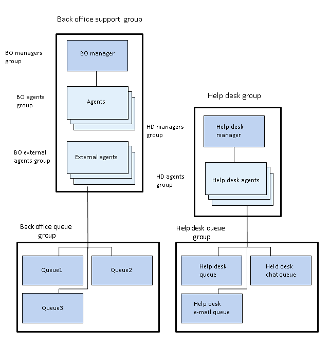 • Direct rights: supervisor-related and monitoring rights to Back office support group, BO external agents group, BO agents group, and BO managers group