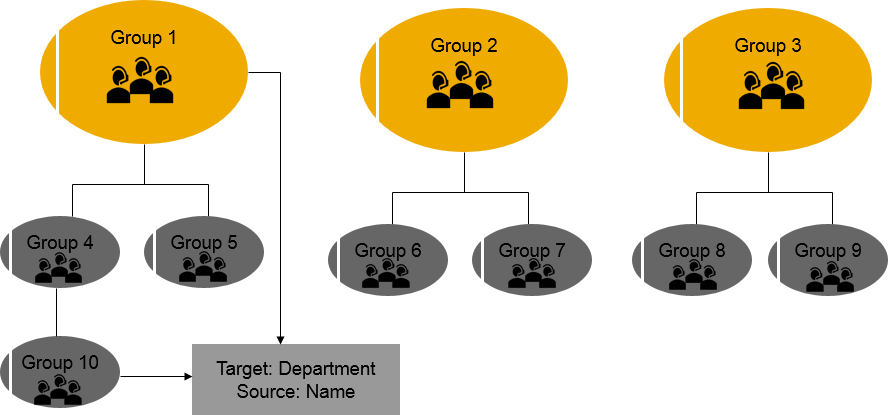 The requested attribute is searched for in the groups to which the user belongs. If various values are found, the nearest one is used (in this case the different group branches are found from Group 1