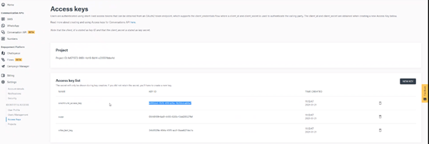 - Service connection which is of format https://[landscape either eu or na].conversation.api.sinch.com/v1beta/projects/[project ID]/messages:send