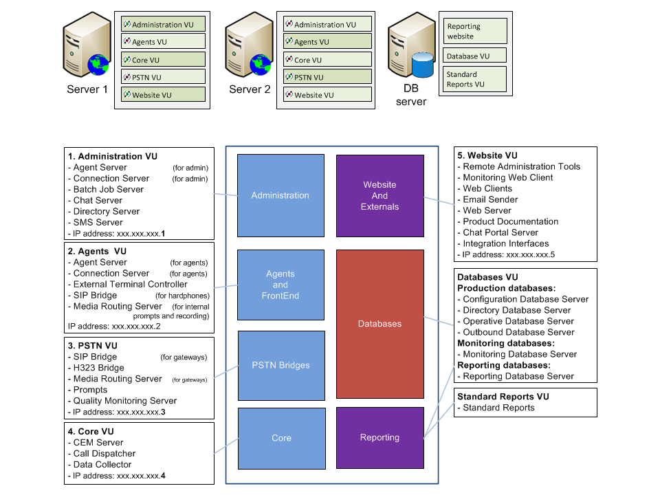 A redundant setup requires two application servers on which the virtual units are distributed so that primary units are on one, and backup units are on the other one, and a database server that is a redundant cluster. An example of virtual unit plan is shown in the figure below.