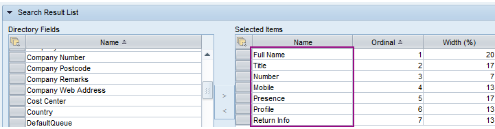 - In the Search Result List block, choose the directory fields you want to appear in the search results area in CDT.