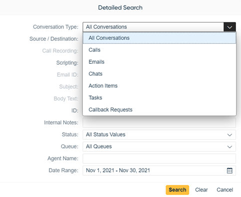 This view aims (based on configuration) to provide you an insight to all conversations across the contact center. The default listing is based on your own conversations for the current day. To further define listings, use the detailed search, sort or filter options. To view a conversation in detail, select conversations from the History view which in turn opens within My Conversations viewing area.