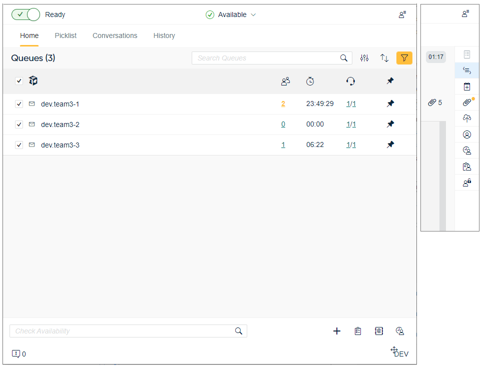 The user interface has by default three fixed tabs Home, Picklist and Conversations. Additional tabbed views of History and Directory are shown by selecting the feature's button.