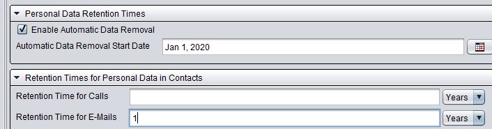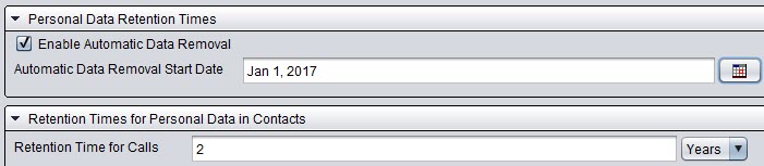 For example, if you have selected the checbox Enable Automatic Data Removal, defined the Automatic Data Removal Start Date to be 1.1.2018, and Retention Time for Calls to be 1 year, the data removal starts on 1.1.2019.