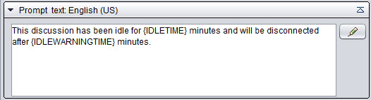 Chat Timeout for Idle Chats Enter a value to define how soon idle chats are removed. A chat is considered idle when there is no active text or video session in progress. The minimum value is 3 minutes and the maximum is 1 day. The default value is 10 minutes.Chat Warning Time for Idle Session Define a time after which a prompt message is sent to inform the customer that the chat has been idle and will be disconnected when the time you defined for Timeout for Idle Chats is reached. Use the prompt type Idle Session Warning Message and the variables Idle Session Duration and Warning Time for Disconnection. For more information, see Creating Prompts.