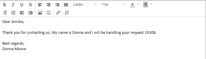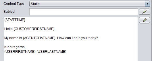 Static templates are essentially text-based replies for use in such cases as an automatic greeting or commonly used responses. In the case of emails this can also contain an attachment with an image, for example a signature. This template type is for use with all channels.