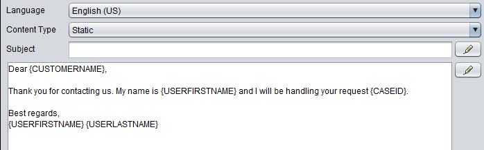 To add the reserved words (or variables), choose the edit icon. To use values retrieved from the database, see below. If you just enter text for the subject, it replaces the original subject when the template is used in answering emails.