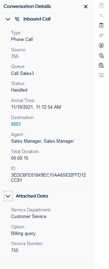 During an active call, the Attached Data in Communication Panel shows data defined in the setting Extra Data Included When Allocating Calls. The history details of the call show the data defined to be included in statistics:
