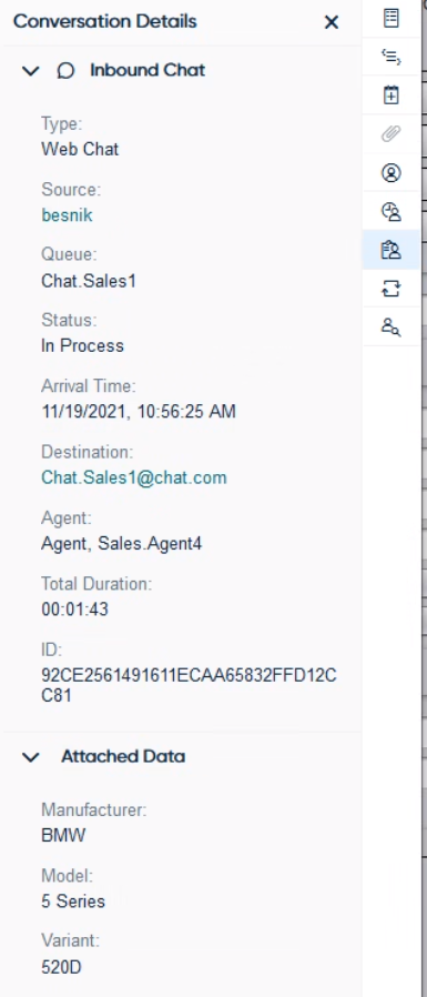 The Attached Data of an active chat in Communication Panel shows all added extra data you have included in your website.