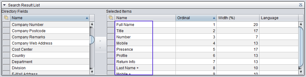 When the items are moved to the Selected Items table, the values for Ordinal and Width (%) are automatically entered.