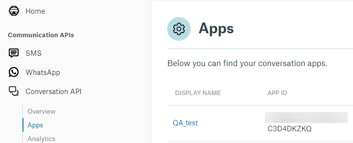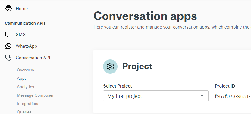 You have created and configured your project and apps API in Sinch Customer Dashboard (https://dashboard.sinch.com/login). For instructions, see https://developers.sinch.com/docs/conversation.