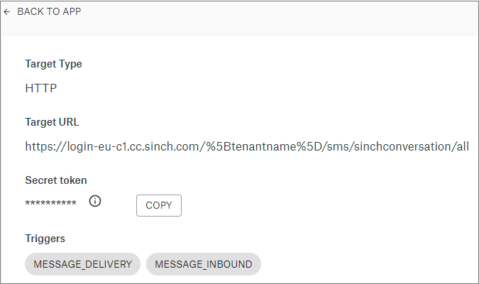 - Service connection of format https://[landscape either eu or us].conversation.api.sinch.com/v1/projects/[project ID]/messages:send