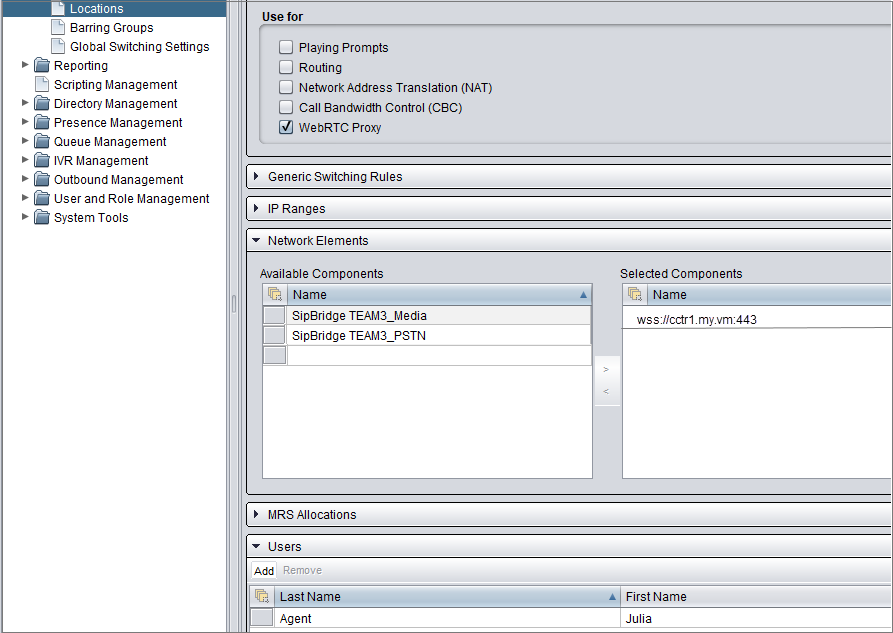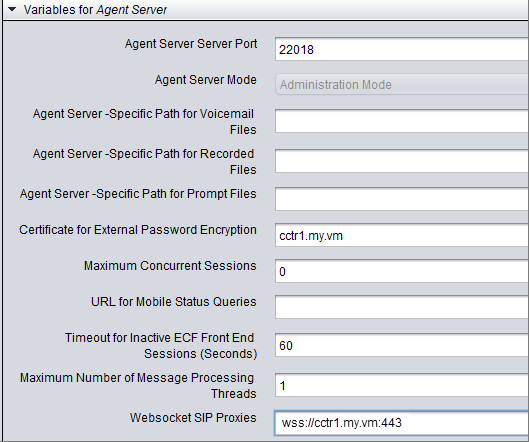 The address is configured as a secure websocket URI, for example wss://cctr1.my.vm:443/. After the system has authenticated an agent with phone rights, Communication Panel opens a websocket to this URL for the phone functionality.