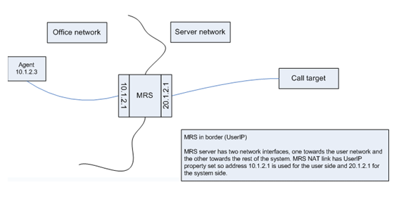 MRS can be configured to separate user and server networks. This is achieved by the User IP setting, MRS uses one IP address towards the location (or users), and another towards the other locations (server network).