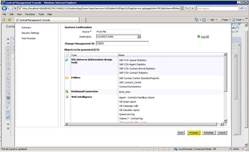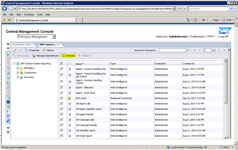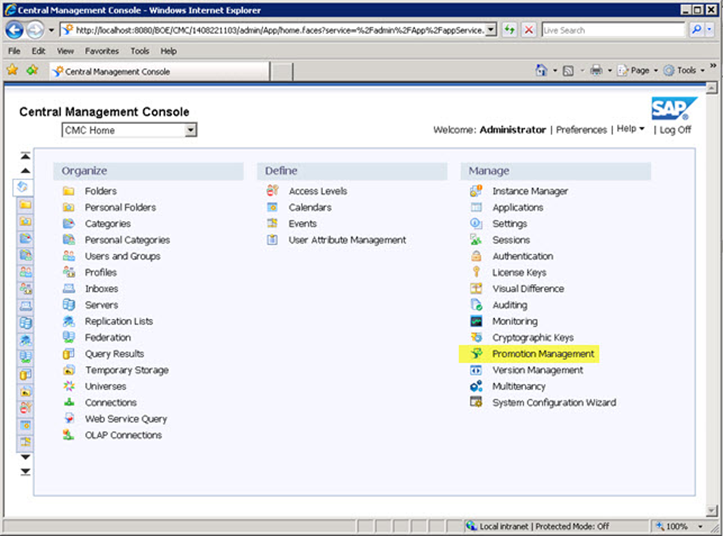 1. To open the Business Objects server tool Promotion Management, choose Start > Programs > SAP BusinessObjects BI platform 4 > SAP BusinessObjects BI Platform Central Management Console.