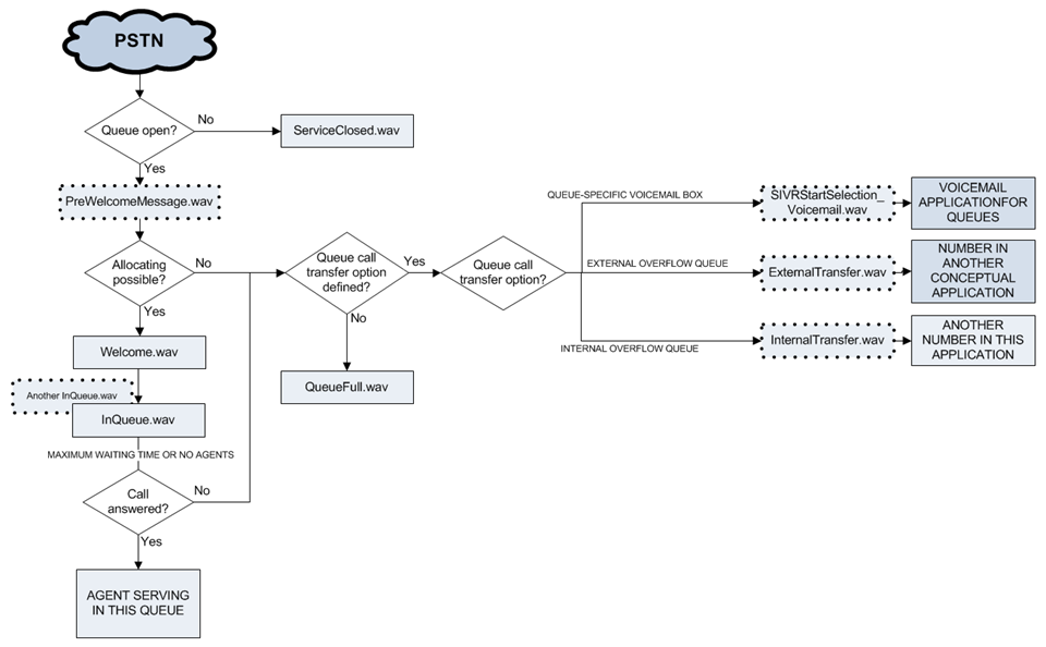 The queue prompts are audio messages played to the callers in different phases of the call. There are generic built-in prompts that are included in the build, but you can add customized prompts for the same functions in the System Configurator . The following diagram describes the basic procedure for routing inbound queue calls: