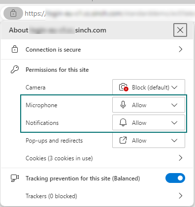 Note that if you use an integration, for example, Communication Panel embedded in SAP Service Cloud (C4C), you must allow microphone access in your browser for both pages (sinch.com and C4C ondemand.com).