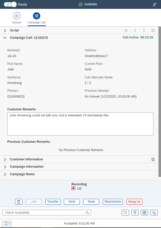 - If the customer is unable to talk right now, define a new time for the call. Choose the Reschedule button.