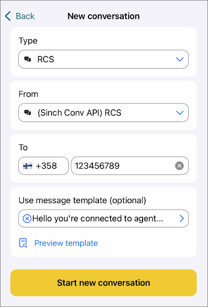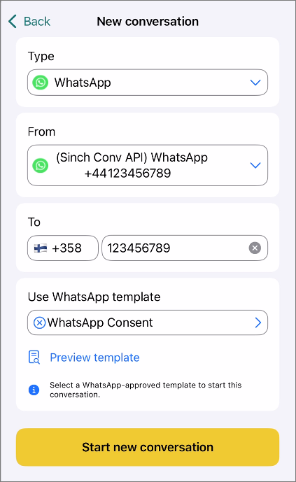 If you're trying to send a WhatsApp message but 24 hours have passed since the customer's previous WhatsApp message, you'll need to select a WhatsApp-approved template to start the conversation: