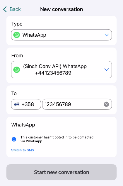 If you're trying to send a WhatsApp message but the customer hasn't opted in to be contacted via WhatsApp, the app suggests you switch to SMS: